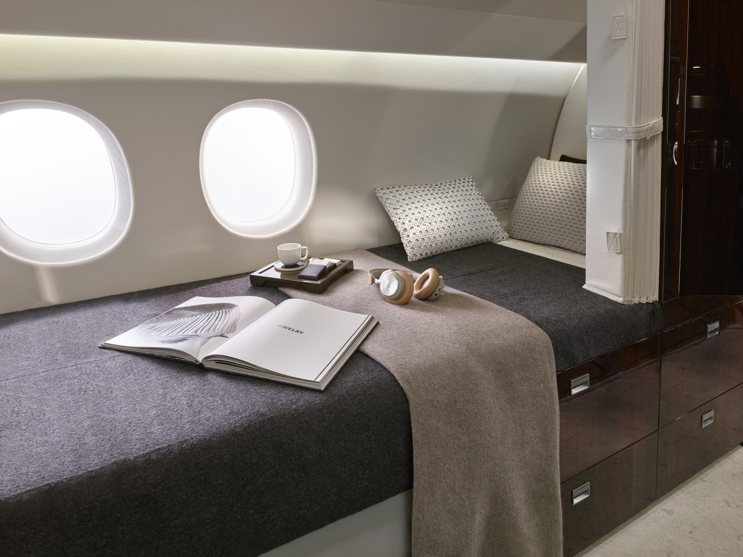 A new Innovative Cabin System (ICS) combines and simplifies control of cabin management and entertainment functions. The ICS interface is intuitive and can be activated via a personal device (as many passengers prefer) or via cabin touch panels. The latter are literally at your fingertips, flush mounted into the cabin side ledge. Touch sensitivity is similar to that on a smart phone or tablet device.