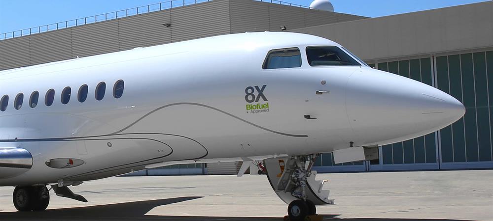 The second thing you can do is fill it up with sustainable alternative jet fuel—SAJF. Or, rather, fill it as much as 50 percent with SAJF. All Falcons can accept internationally certified bio fuels at up to 50 percent blends with traditional Jet-A.
